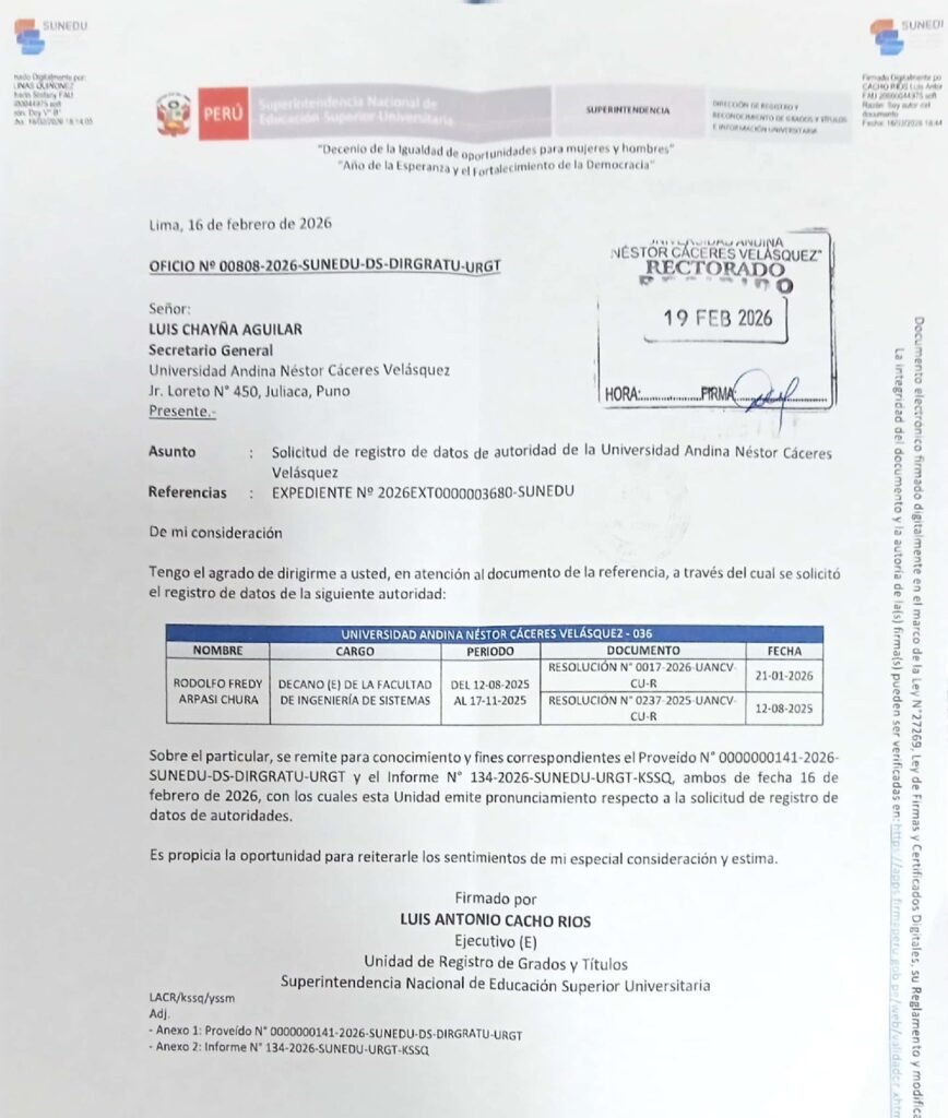La Universidad Andina Néstor Cáceres Velásquez (UANCV) comunica a la comunidad universitaria y a la ciudadanía en general que la Superintendencia Nacional de Educación Superior Universitaria (SUNEDU) ha reconocido oficialmente al decano de la Facultad de Ingeniería de Sistemas en el Registro de Datos de Autoridades Universitarias.